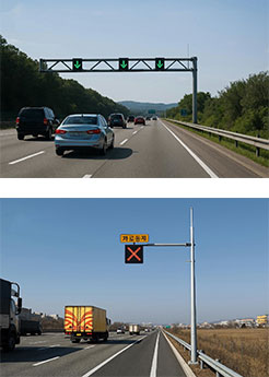 또는 터널, 교량등 교통사고 발생 시 돌발상황에 신속히 대응토록 LCS (Lane ControlSystem) 신호기를 500m 간격으로 설치하여 녹색화살표와 적색 X표로 표시한다.